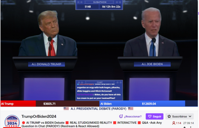 El poder de IA también se hizo claro en una parodia en Twitch que utilizó voz, texto e imagen, de un debate imaginario entre Trump y Biden, burdo y por momentos divertido.
