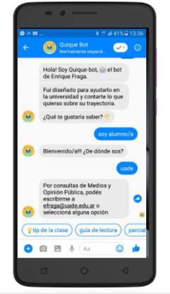 Ansioso por poner en marcha una plataforma, se me ocurrió diseñar a “Quique bot”, un chatbot publicado en Facebook Messenger al que entrené con toda aquella información que los alumnos siempre me suelen preguntar y repreguntar a lo largo del cuatrimestre: desde fechas de examen, apuntes, bibliografía, consignas de trabajos prácticos, etc… Es decir, aquella información de rutina que todo curso posee.