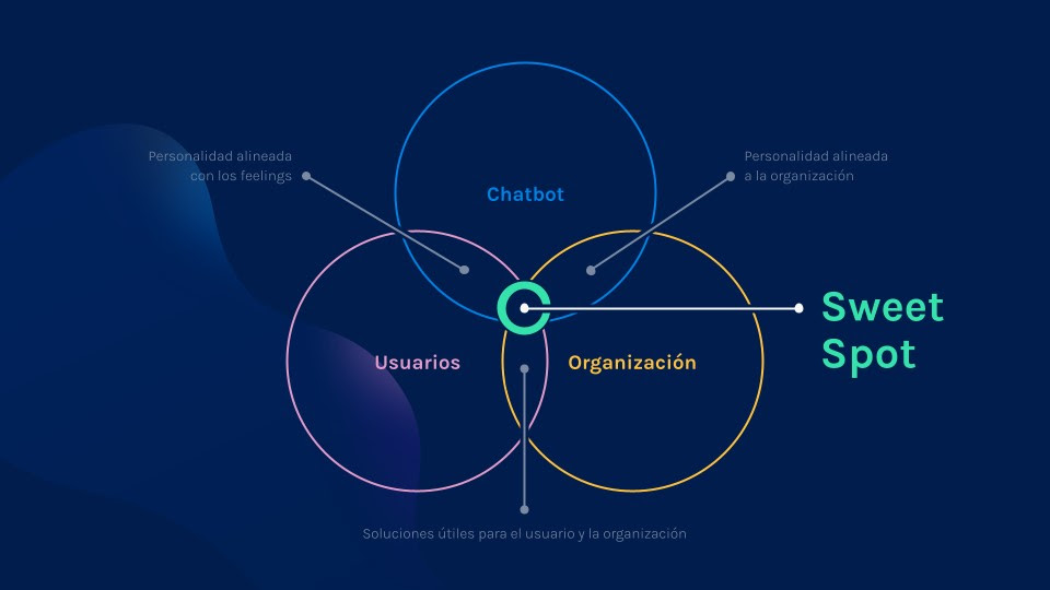 -Antes que nada, el primer paso para diseñar un bot es darle una razón de ser en el mundo. Nos preguntamos por qué el planeta Tierra necesita este bot y vemos de qué manera va a cumplir un objetivo. Para lograr esto hablamos mucho con la organización para comprender sus objetivos. Una vez que logramos eso, buscamos alinear y encontrar este sweet spot, que es la unión de estas tres cosas: el chatbot, los usuarios y la organización, junto con la relación entre todas estas partes.