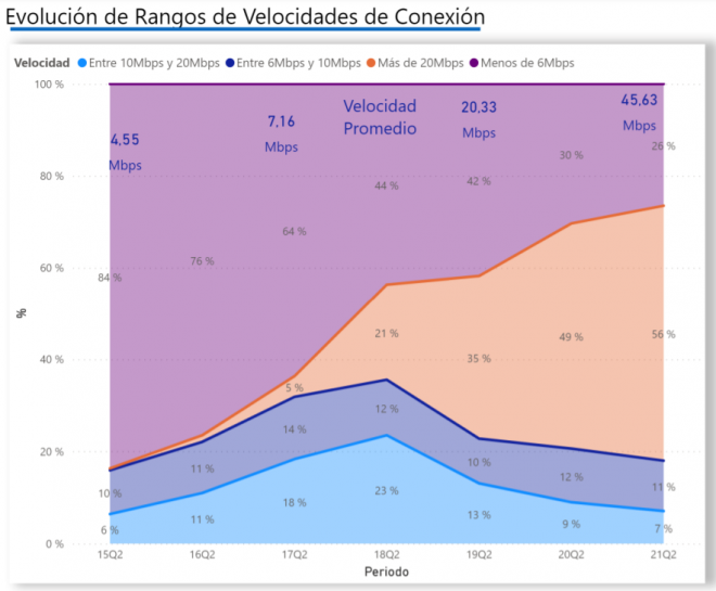 Según el informe de Cabase, “cada año crecen las conexiones con mayor velocidad de descarga, con especial énfasis a partir de 2018, donde las conexiones con más de 20 mbps comienzan un vertigionso ascenso, llegando a representar a junio de 2021 más del 55% del total de conexiones a nivel nacional, ubicándose la velocidad promedio en 45,63 mbps”. Desde 2017, la velocidad promedio se multiplicó por seis.